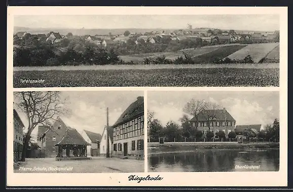 AK Ziegelroda, Totalansicht, Pfarre mit Schule und Glockenstuhl, Oberförsterei