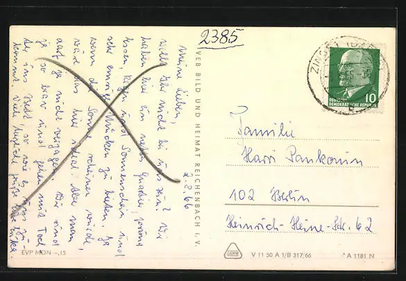 Personenbezogene Daten auf der Rückseite der Karte wurden durch blauen Textmarker unkenntlich gemacht. Die blauen Stellen sind auf die Vorderseite durchgeweicht und wirken sich negativ auf das Postkartenfoto aus