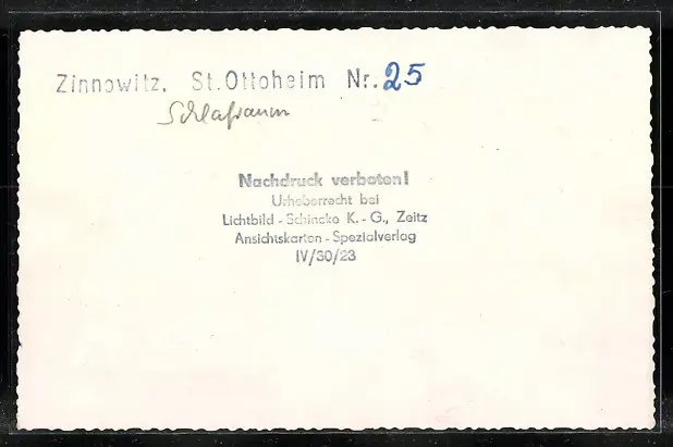 Personenbezogene Daten auf der Rückseite der Karte wurden durch blauen Textmarker unkenntlich gemacht. Die blauen Stellen sind auf die Vorderseite durchgeweicht und wirken sich negativ auf das Postkartenfoto aus