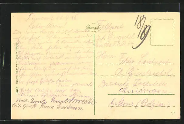 Personenbezogene Daten auf der Rückseite der Karte wurden durch blauen Textmarker unkenntlich gemacht. Die blauen Stellen sind auf die Vorderseite durchgeweicht und wirken sich negativ auf das Postkartenfoto aus