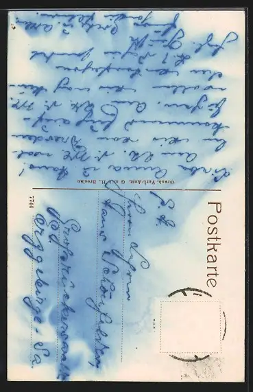 Personenbezogene Daten auf der Rückseite der Karte wurden durch blauen Textmarker unkenntlich gemacht. Die blauen Stellen sind auf die Vorderseite durchgeweicht und wirken sich negativ auf das Postkartenfoto aus