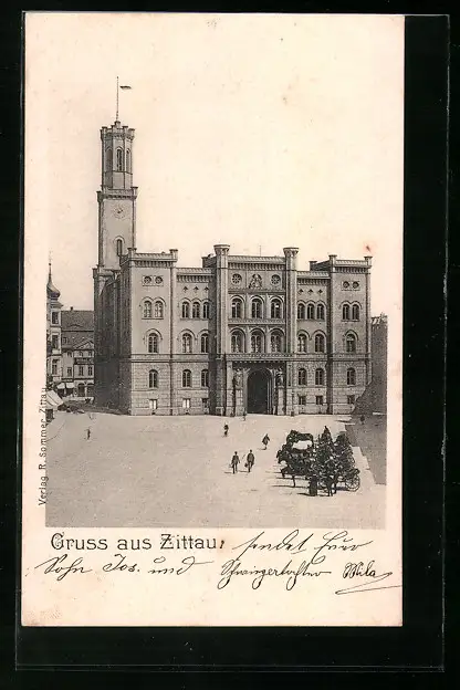 AK Zittau, Gebäudeansicht mit Kutschen