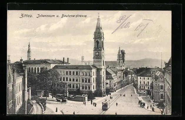 AK Zittau, Johanneum und Bautznerstrasse mit Strassenbahn