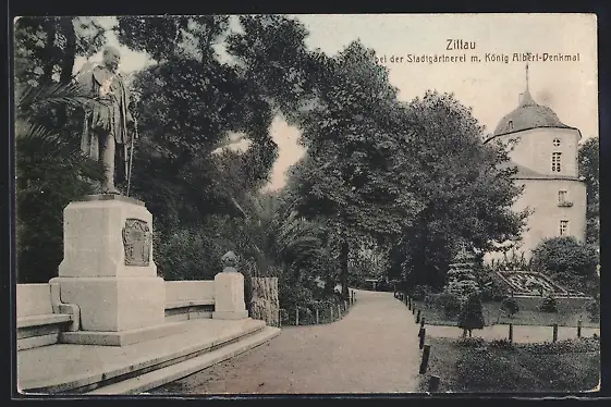 AK Zittau, König Albert-Denkmal mit Stadtgärtnerei