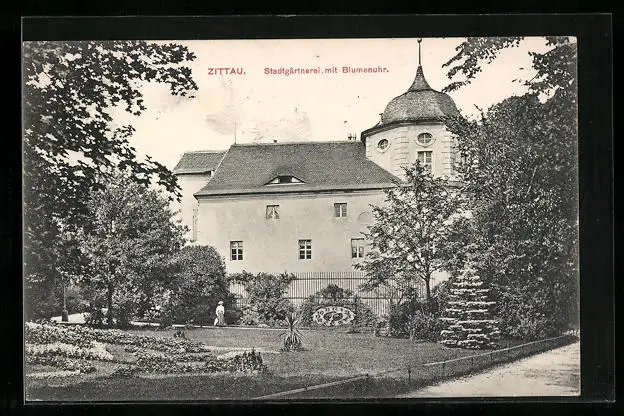 AK Zittau, Stadtgärtnerei mit Blumenuhr