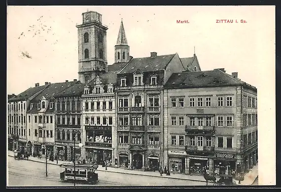 AK Zittau i. Sa., Strassenbahn am Markt mit Geschäften