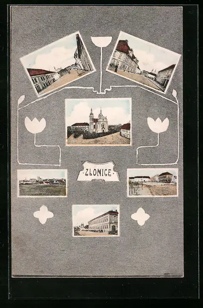 AK Zlonice, Kirche, Strassenpartie, Ortsansicht