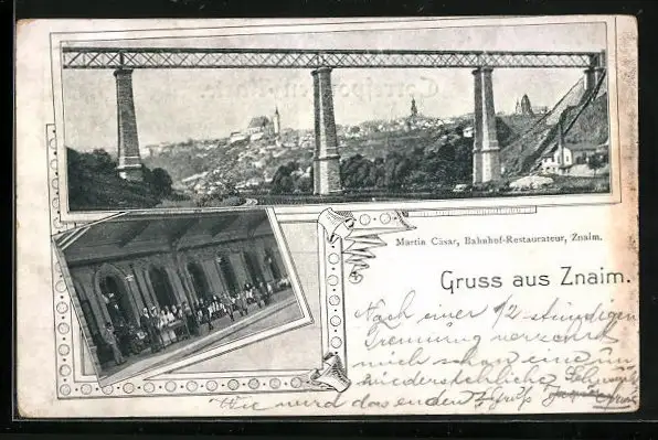 AK Znaim, Bahnhof und Viadukt mit Ortsansicht