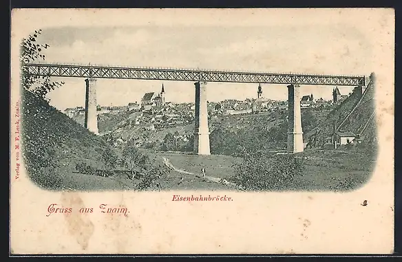 AK Znaim, Blick auf Eisenbahnbrücke und Ort
