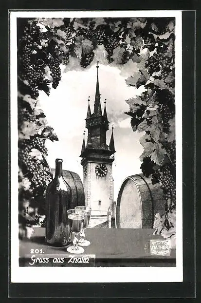 AK Znaim, Der Rathausturm hinter Weinfässern