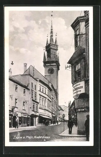 AK Znaim, Einkaufstrasse mit Rathausturm