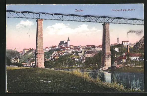 AK Znaim, Nordwestbahn-Brücke mit Fluss vor der Stadt