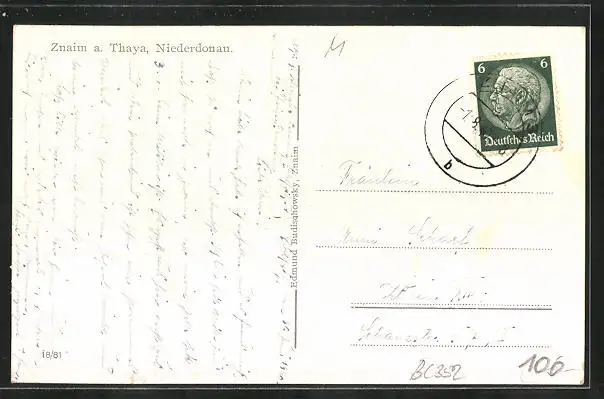 Personenbezogene Daten auf der Rückseite der Karte wurden durch blauen Textmarker unkenntlich gemacht. Die blauen Stellen sind auf die Vorderseite durchgeweicht und wirken sich negativ auf das Postkartenfoto aus