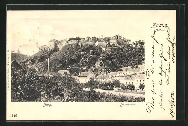 AK Znaim, Ortsansicht mit Burg und Brauhaus