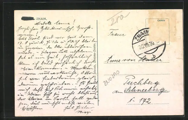 Personenbezogene Daten auf der Rückseite der Karte wurden durch blauen Textmarker unkenntlich gemacht. Die blauen Stellen sind auf die Vorderseite durchgeweicht und wirken sich negativ auf das Postkartenfoto aus