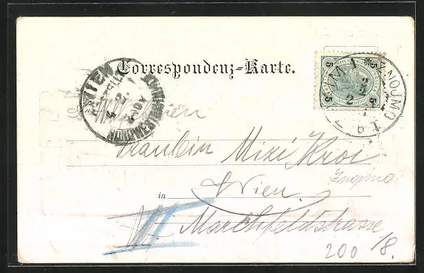Personenbezogene Daten auf der Rückseite der Karte wurden durch blauen Textmarker unkenntlich gemacht. Die blauen Stellen sind auf die Vorderseite durchgeweicht und wirken sich negativ auf das Postkartenfoto aus