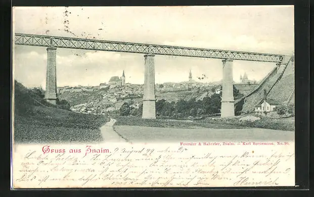 AK Znaim, Viaduct mit Ortsansicht in der Ferne