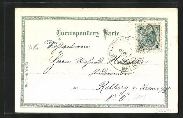 Personenbezogene Daten auf der Rückseite der Karte wurden durch blauen Textmarker unkenntlich gemacht. Die blauen Stellen sind auf die Vorderseite durchgeweicht und wirken sich negativ auf das Postkartenfoto aus
