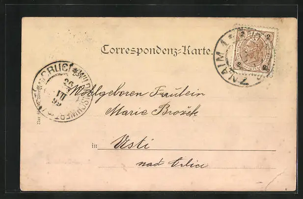 gelaufen 1899, Eckknick unten li., Stempelspur, guter Zustand