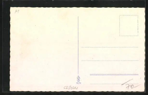 Personenbezogene Daten auf der Rückseite der Karte wurden durch blauen Textmarker unkenntlich gemacht. Die blauen Stellen sind auf die Vorderseite durchgeweicht und wirken sich negativ auf das Postkartenfoto aus
