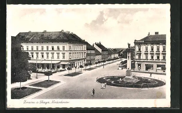 AK Znaim a. d. Thaya, Strassenpartie mit Denkmal