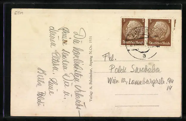 Personenbezogene Daten auf der Rückseite der Karte wurden durch blauen Textmarker unkenntlich gemacht. Die blauen Stellen sind auf die Vorderseite durchgeweicht und wirken sich negativ auf das Postkartenfoto aus
