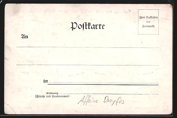 Personenbezogene Daten auf der Rückseite der Karte wurden durch blauen Textmarker unkenntlich gemacht. Die blauen Stellen sind auf die Vorderseite durchgeweicht und wirken sich negativ auf das Postkartenfoto aus