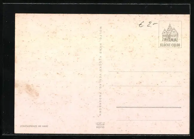 Personenbezogene Daten auf der Rückseite der Karte wurden durch blauen Textmarker unkenntlich gemacht. Die blauen Stellen sind auf die Vorderseite durchgeweicht und wirken sich negativ auf das Postkartenfoto aus