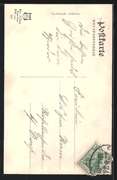alte Ansichtskarte, gelaufen 1907, rückseitig Oberflächenschaden, guter Zustand