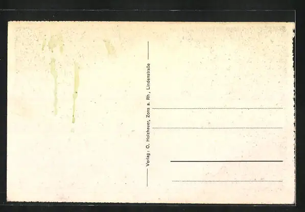 Personenbezogene Daten auf der Rückseite der Karte wurden durch blauen Textmarker unkenntlich gemacht. Die blauen Stellen sind auf die Vorderseite durchgeweicht und wirken sich negativ auf das Postkartenfoto aus