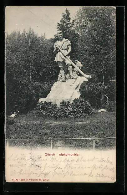AK Zürich, Ansicht eines Alphornbläsers, Statue