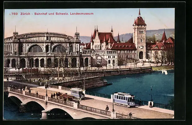 AK Zürich, Bahnhof, Landesmuseum & Strassenbahnen