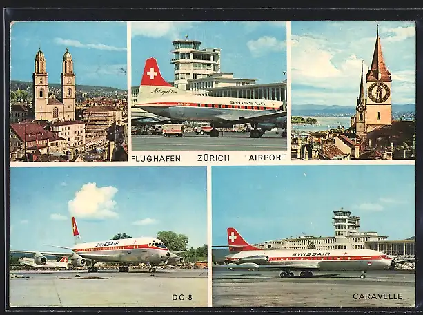 AK Zürich, Flughafenmotive mit DC-8 und Caravelle