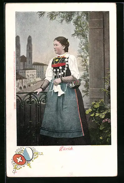 AK Zürich, Frau in Tracht vor Stadtpanorama