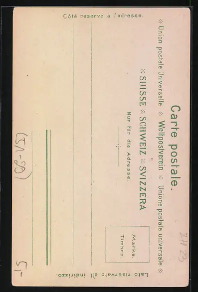 Personenbezogene Daten auf der Rückseite der Karte wurden durch blauen Textmarker unkenntlich gemacht. Die blauen Stellen sind auf die Vorderseite durchgeweicht und wirken sich negativ auf das Postkartenfoto aus