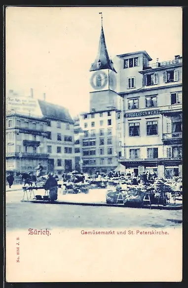 AK Zürich, Gemüsemarkt und St. Peterskirche