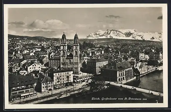 AK Zürich, Grossmünster vom St. Petersturm aus