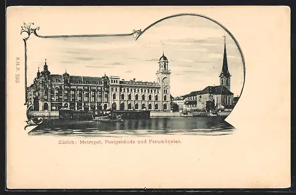 AK Zürich, Metropol, Postgebäude und Fraumünster, Dampfer