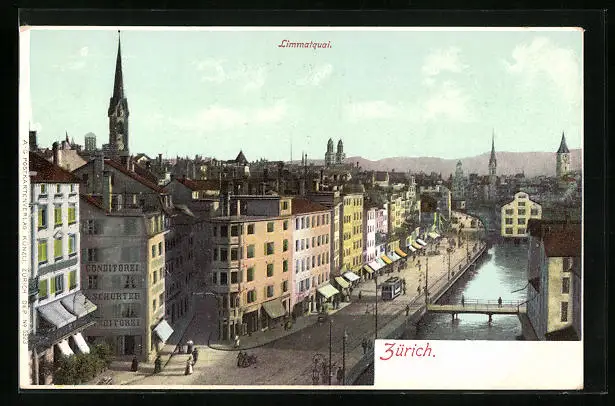 AK Zürich, Partie am Limmatquai mit Strassenbahn