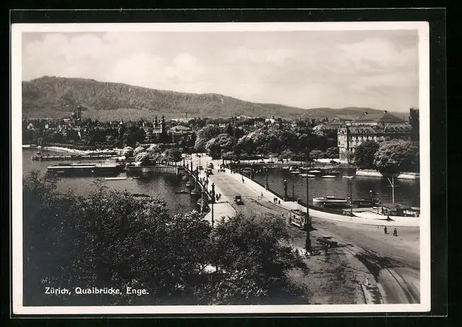 AK Zürich, Quaibrücke und Enge mit Strassenbahn