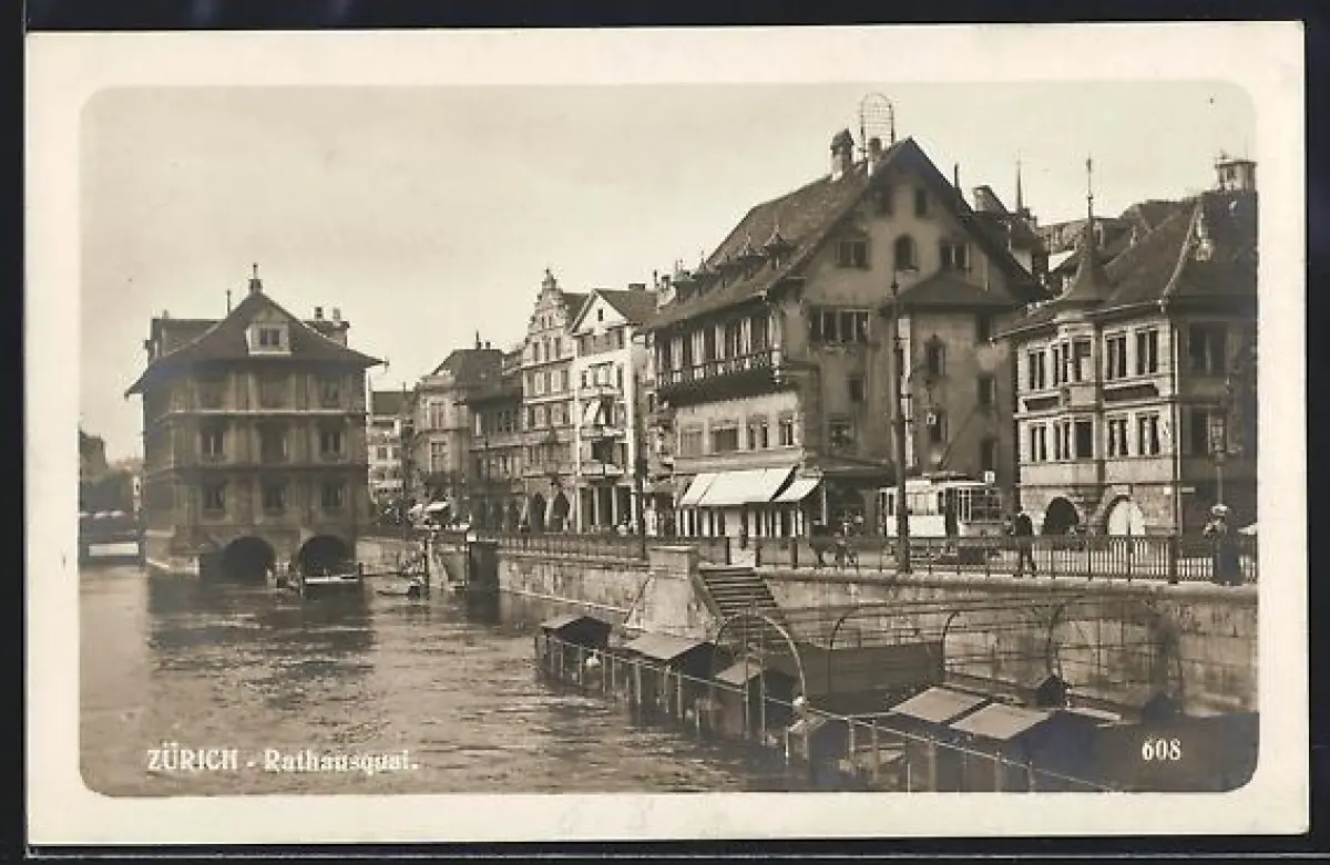 AK Zürich, Rathausquai mit Strassenbahn