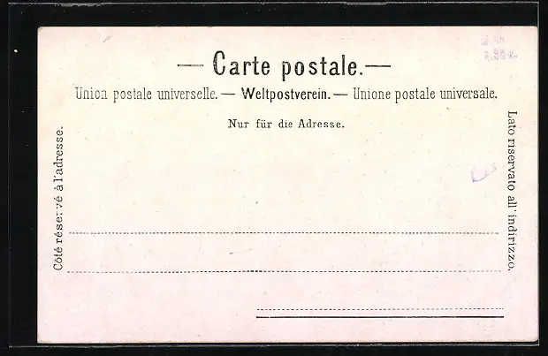 Personenbezogene Daten auf der Rückseite der Karte wurden durch blauen Textmarker unkenntlich gemacht. Die blauen Stellen sind auf die Vorderseite durchgeweicht und wirken sich negativ auf das Postkartenfoto aus