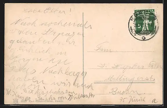 Personenbezogene Daten auf der Rückseite der Karte wurden durch blauen Textmarker unkenntlich gemacht. Die blauen Stellen sind auf die Vorderseite durchgeweicht und wirken sich negativ auf das Postkartenfoto aus