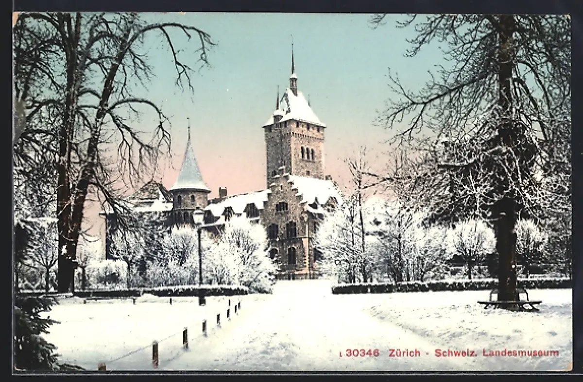 AK Zürich, Schweiz. Landesmuseum mit Anlage im Winter
