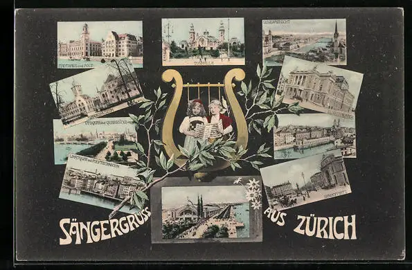 AK Zürich, Stadthaus und Post, Tonhalle, Stadttheater, Harfe mit Sängern