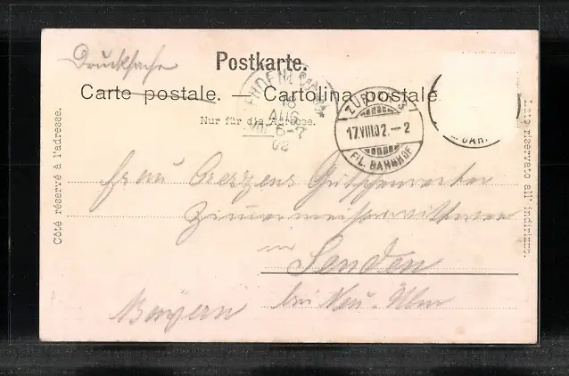 gelaufen 1902, Briefmarke entfernt, rückseitig Oberflächenschaden, Albumspuren, Eckknick li. oben, guter Zustand