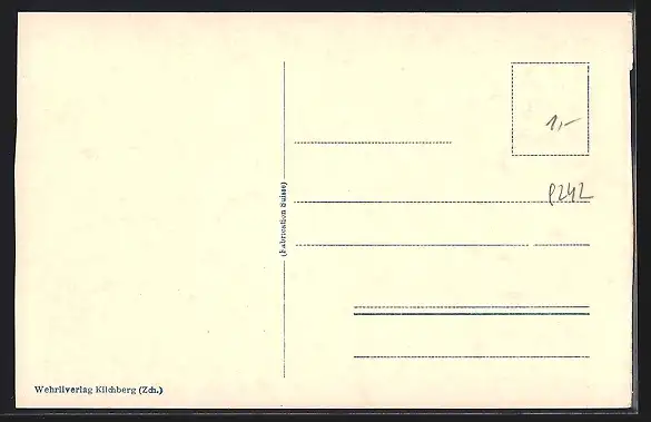 Personenbezogene Daten auf der Rückseite der Karte wurden durch blauen Textmarker unkenntlich gemacht. Die blauen Stellen sind auf die Vorderseite durchgeweicht und wirken sich negativ auf das Postkartenfoto aus
