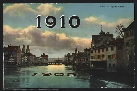 AK Zürich, Sylversternach 1909 1910, Ortsansicht mit Brücke
