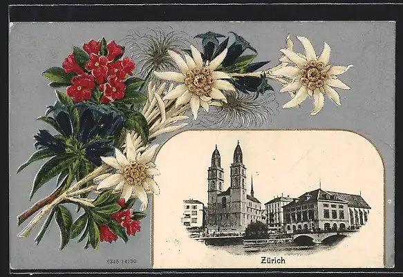 AK Zürich, Uferpartie mit Kirche, Alpenblumen, Passepartout