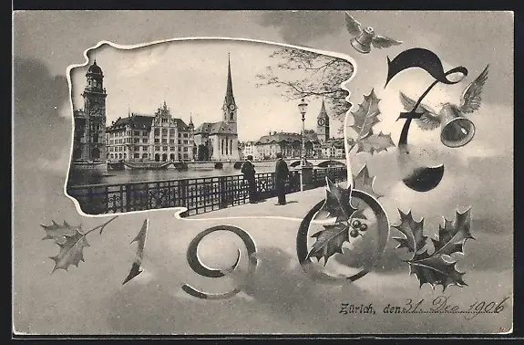 AK Zürich, Uferpartie mit Kirche, Jahreszahl 1907, Passepartout